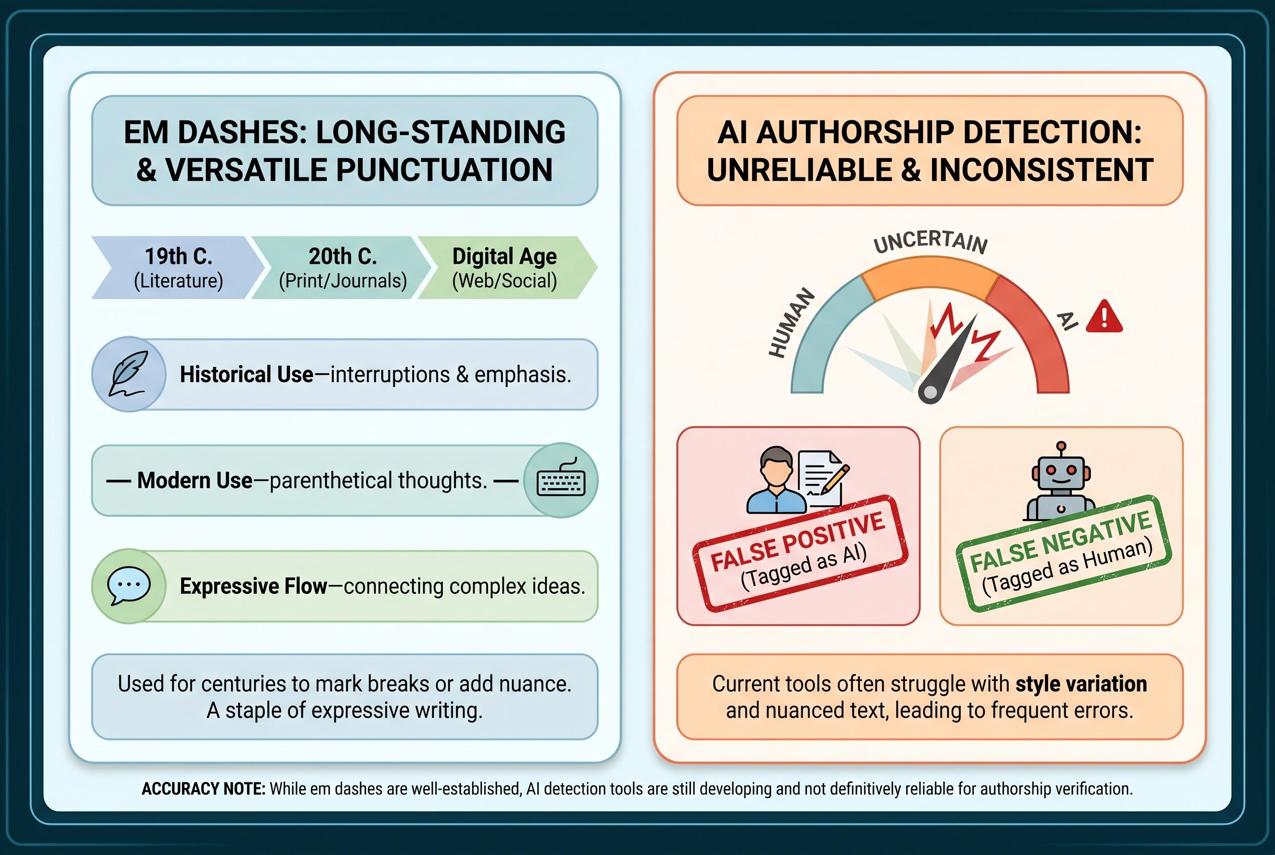 The myth that em dashes signal artificial writing endures, but experts argue that their long-standing use in language shows the question of authorship lies elsewhere, as AI detection remains unreliable.