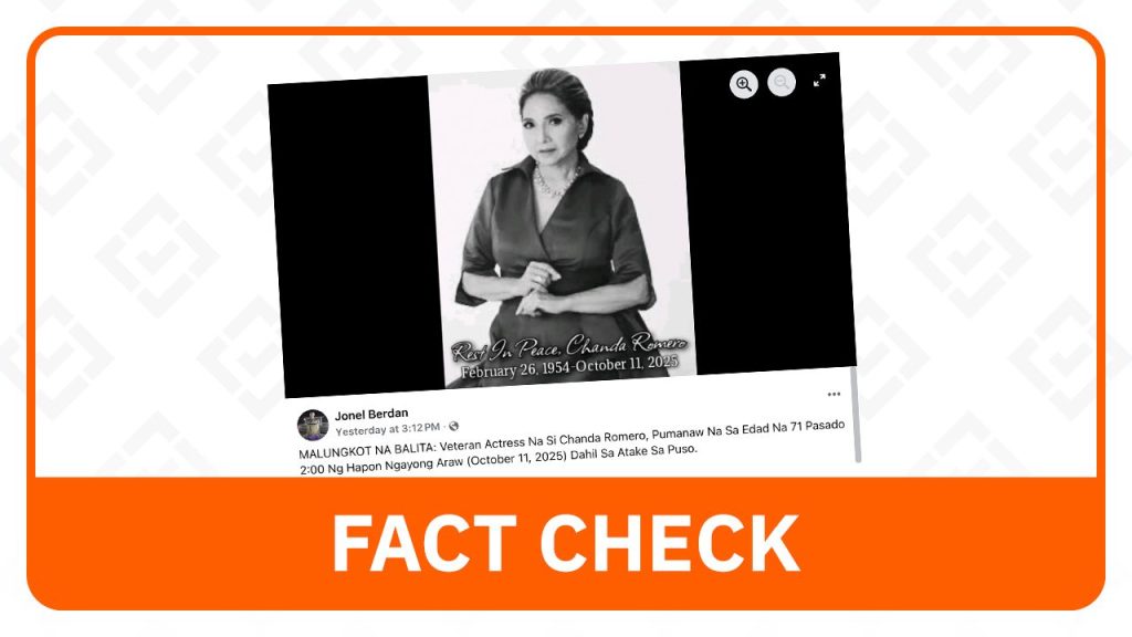 A Facebook post that gained significant traction—accumulating over 2,100 reactions, 390 comments, and 110 shares—falsely claimed that Romero had passed away from a heart attack. The misleading post featured a black and white photograph of the actress alongside text reading, “Rest in Peace, Chanda Romero. February 26, 1954 – October 11, 2025.”