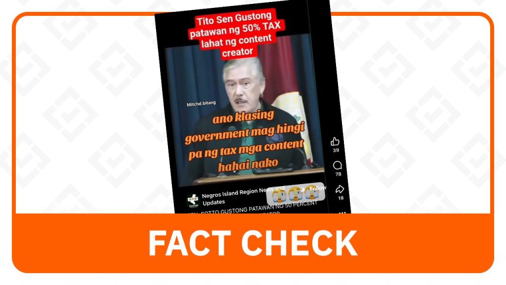Senate President Vicente “Tito” Sotto has categorically denied claims that he proposed a 50% tax on content creators, as a manipulated video circulating on social media falsely suggests.