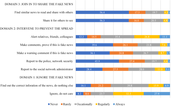 When encountering fake news, participants reported employing different coping strategies, categorized into three domains: ignoring the content, actively intervening to prevent its spread, or participating in sharing the misinformation. These behaviors were measured using nine items with strong internal consistency (Cronbach’s alpha of 0.81).